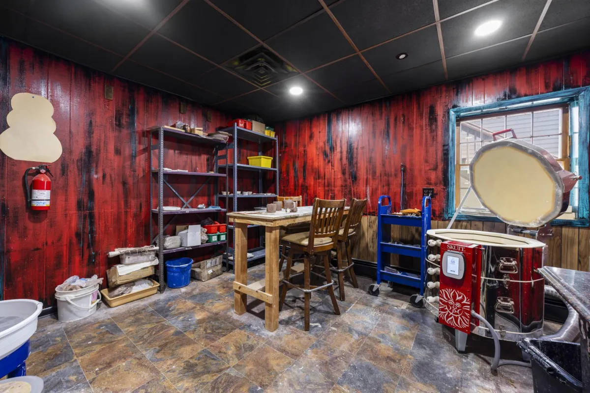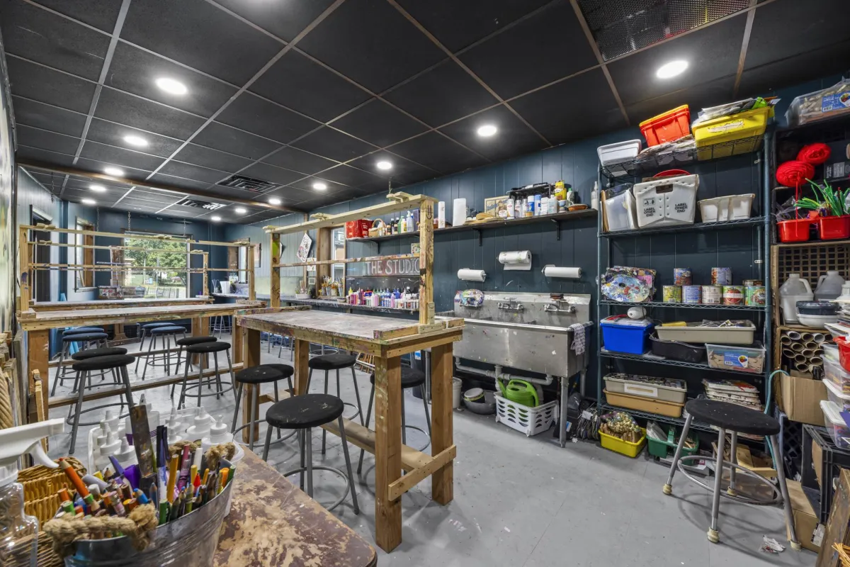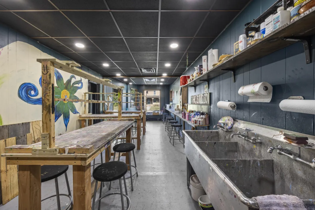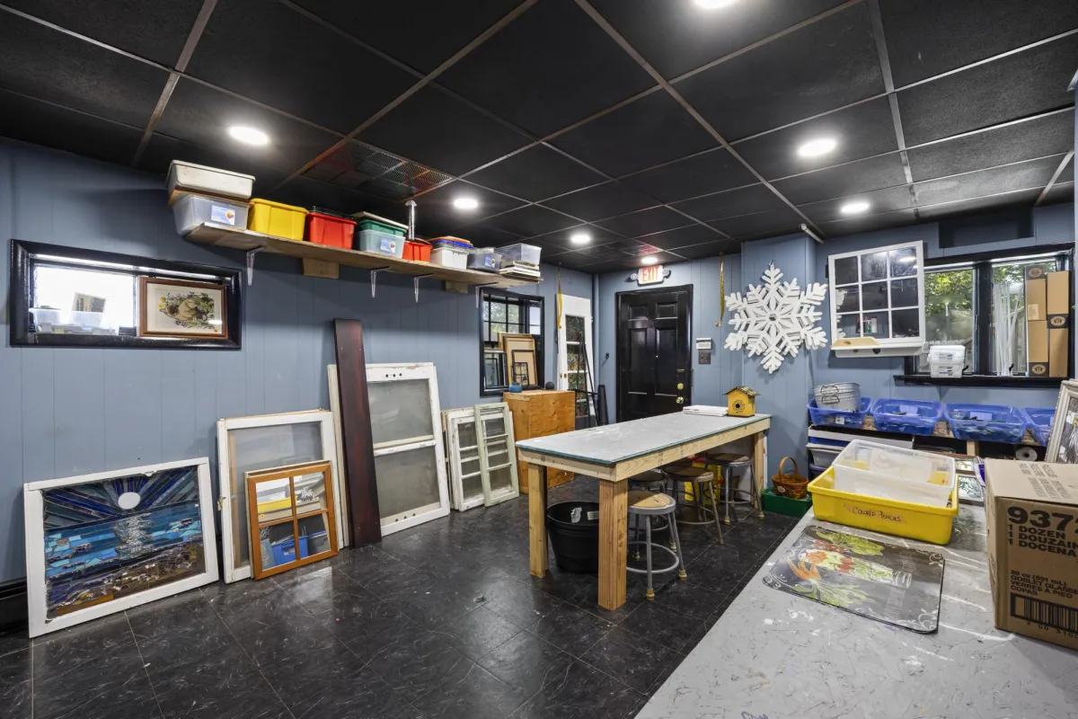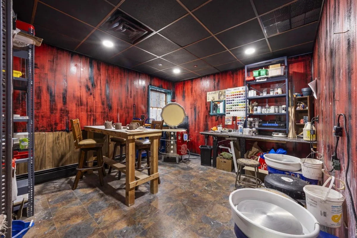 The main level offers finished commercial space, plus bonus workshop and storage areas that add plenty of additional rec room space. Currently configured for art, pottery, and retail use, the space offers versatility for a boutique, salon, creative studio, or office. The standout custom mosaic stone façade catches the eye and adds distinctive curb appeal. The layout includes multiple studios, a half bath, and several flex spaces suitable for a variety of business types.