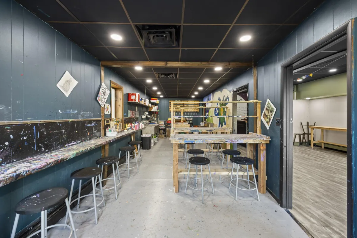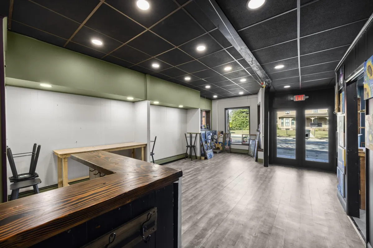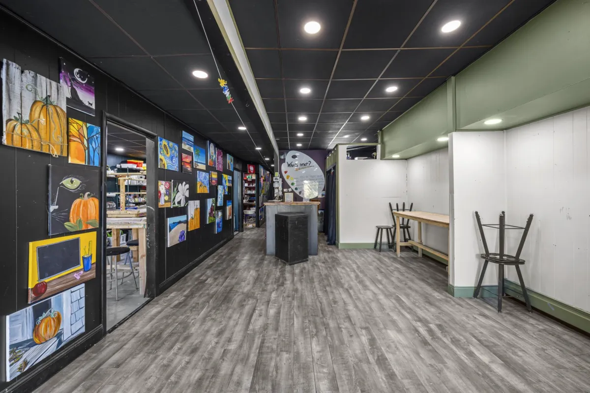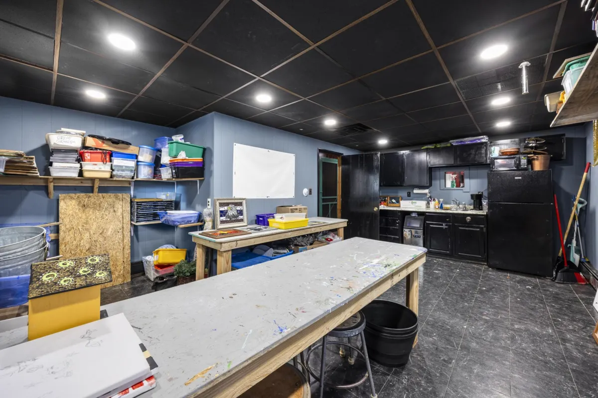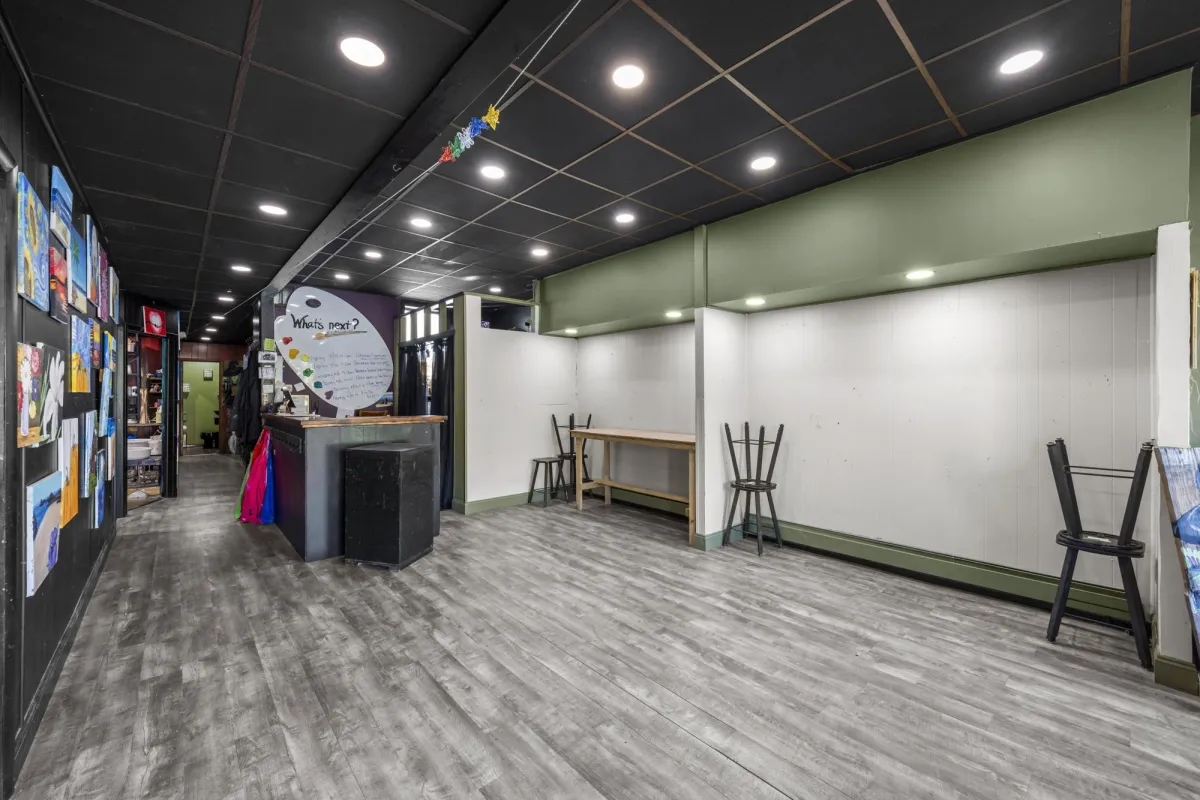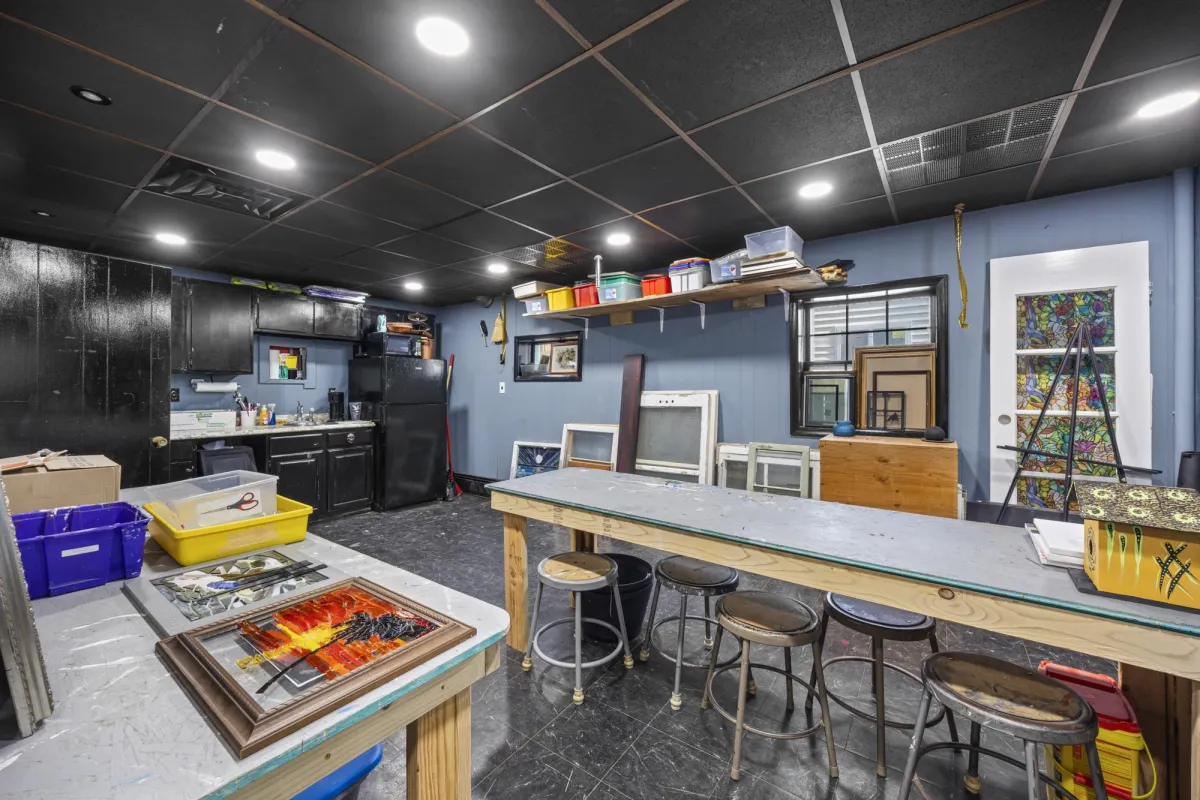 The main level offers finished commercial space, plus bonus workshop and storage areas that add plenty of additional rec room space. Currently configured for art, pottery, and retail use, the space offers versatility for a boutique, salon, creative studio, or office. The standout custom mosaic stone façade catches the eye and adds distinctive curb appeal. The layout includes multiple studios, a half bath, and several flex spaces suitable for a variety of business types.