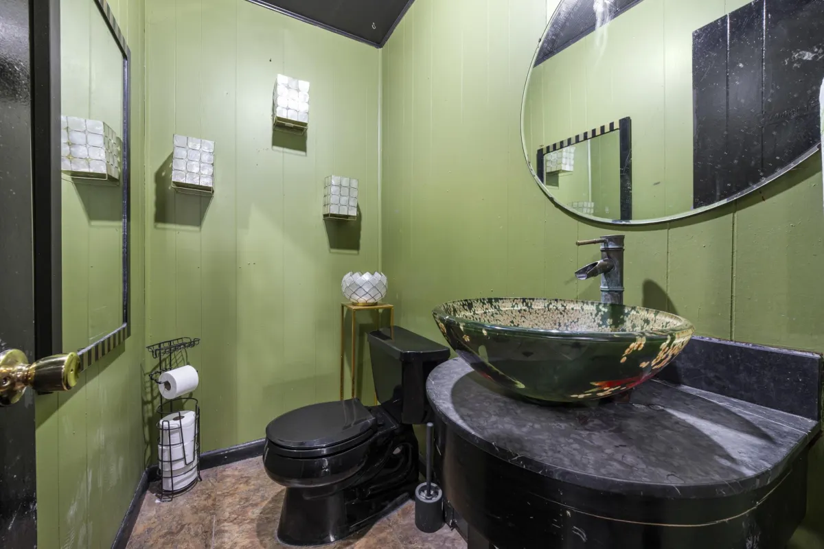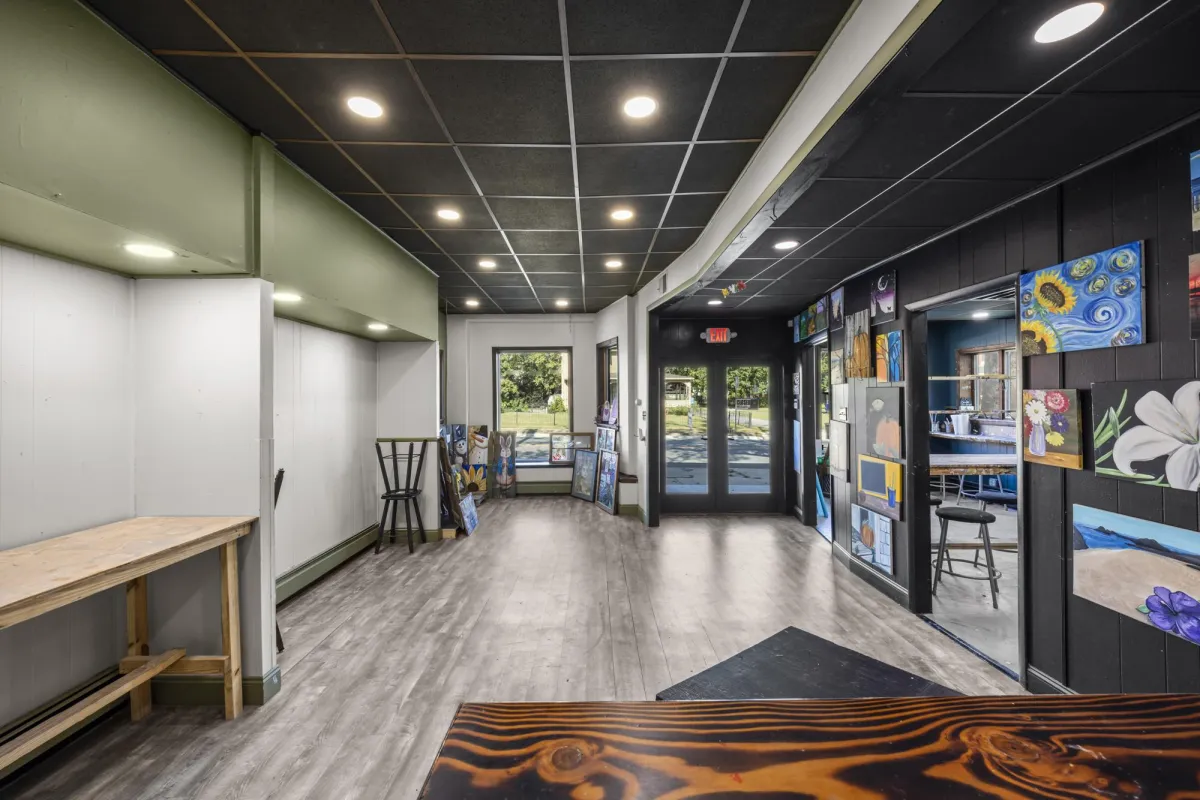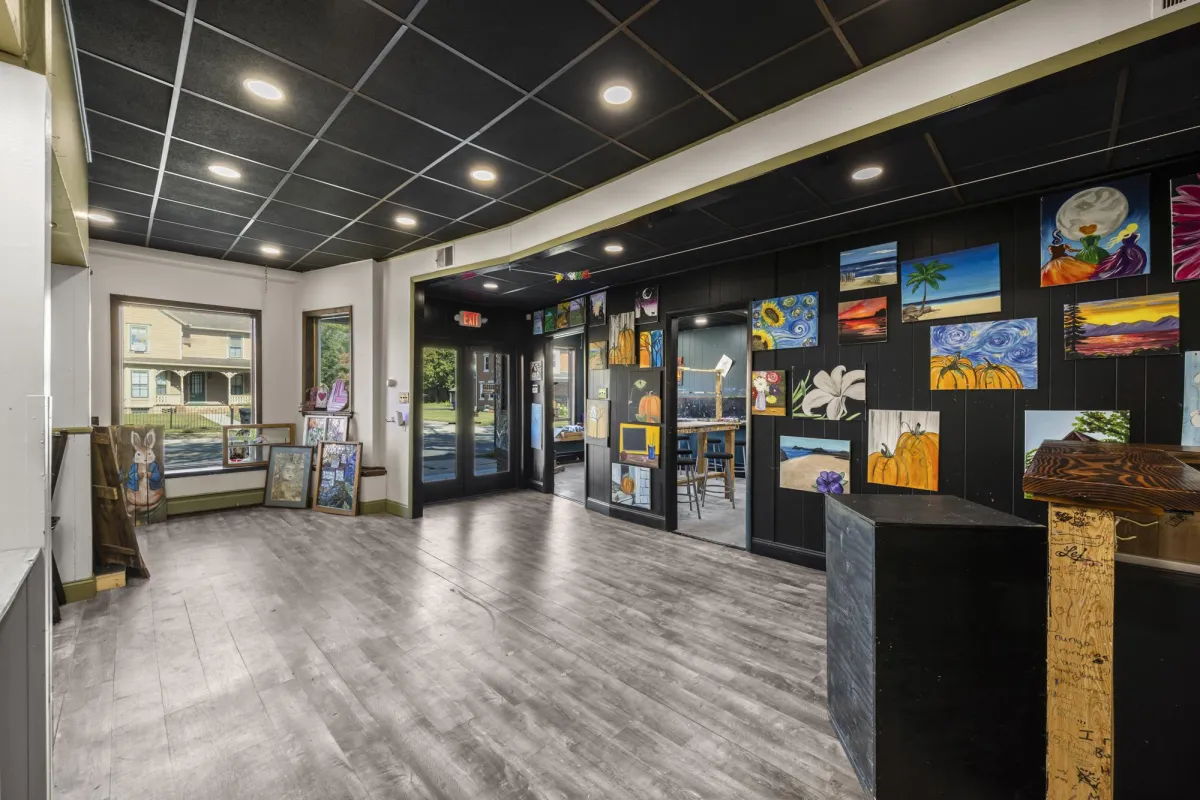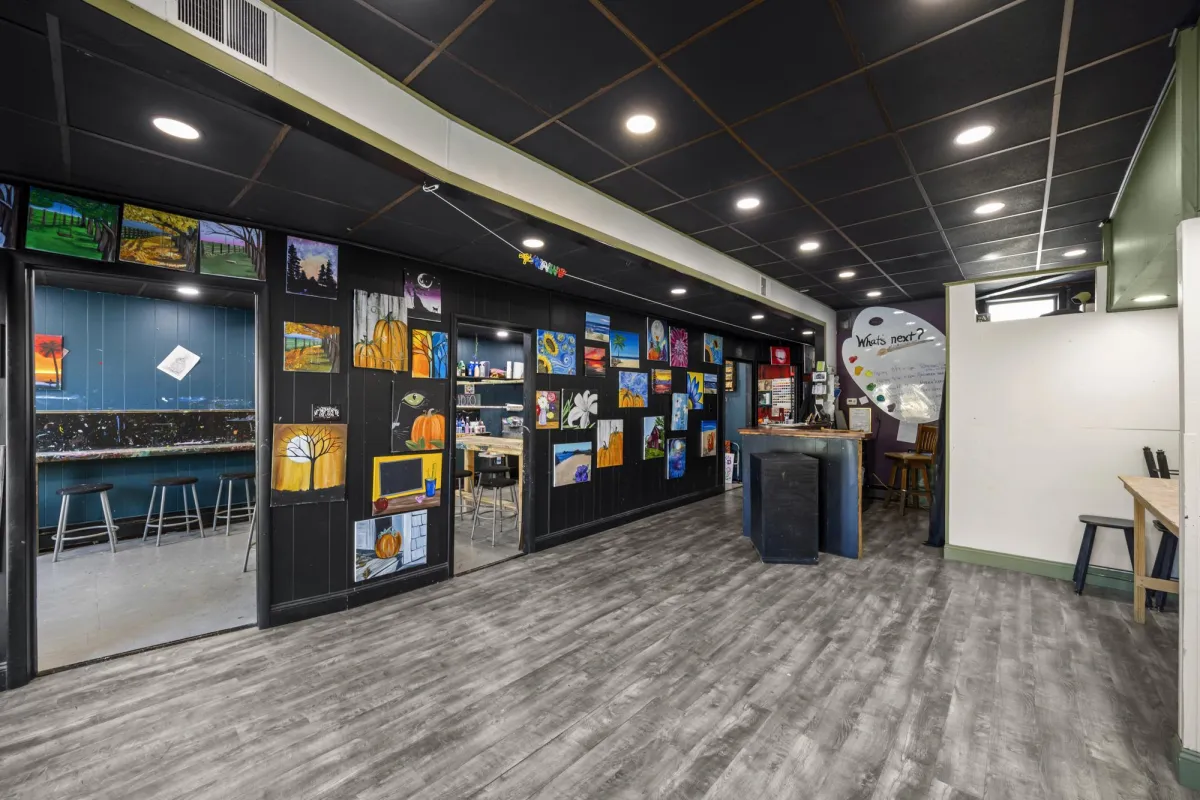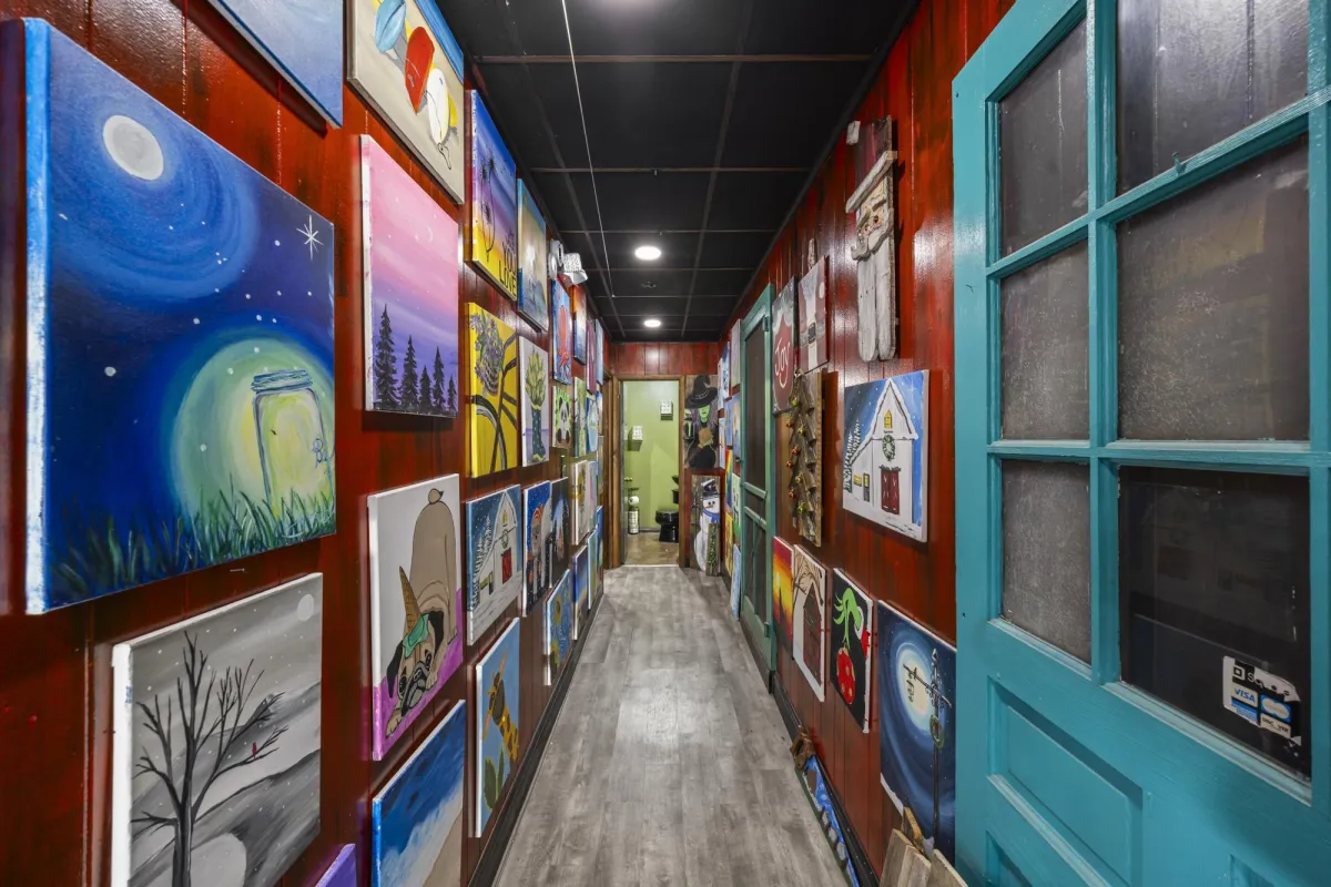 The main level offers finished commercial space, plus bonus workshop and storage areas that add plenty of additional rec room space. Currently configured for art, pottery, and retail use, the space offers versatility for a boutique, salon, creative studio, or office. The standout custom mosaic stone façade catches the eye and adds distinctive curb appeal. The layout includes multiple studios, a half bath, and several flex spaces suitable for a variety of business types.